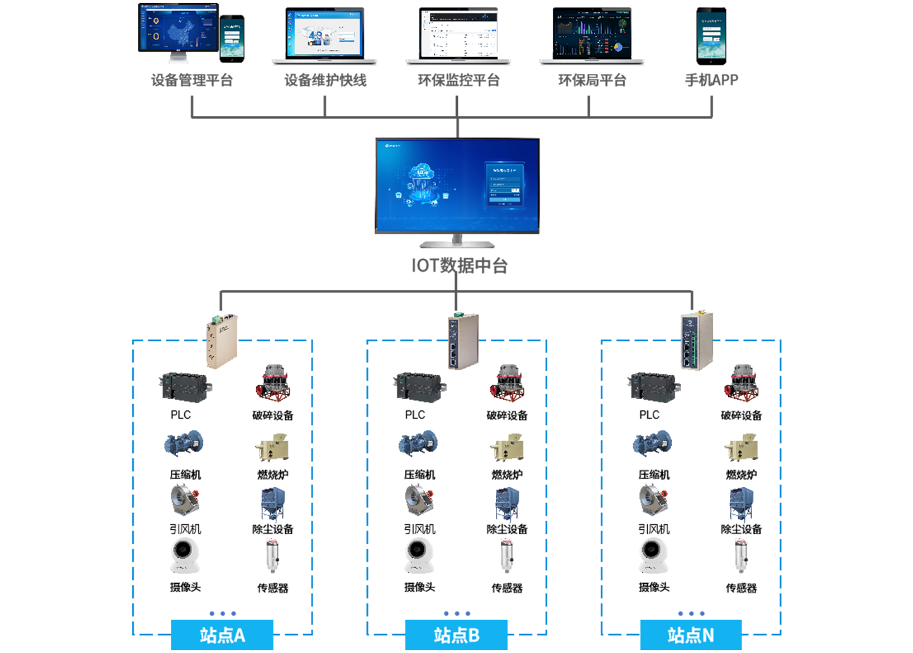 在固廢垃圾處理場的各個關鍵位置(如垃圾存儲區、處理設備旁等)安裝傳感器和監測設備,通過物通博聯的工業智能網關采集垃圾處理設備(如焚燒爐、破碎機等)的運行數據(如運行狀態、溫度、壓力等)、垃圾存量數據以及環境監測數據(如空氣質量、噪聲等)。將采集到的數據傳輸至固廢垃圾處理遠程監控平臺,平臺對數據進行實時分析和展示。當垃圾存量達到預警值或設備出現異常時及時發出預警,支持遠程運維和調度操作,同時對垃圾處理效果進行評估。